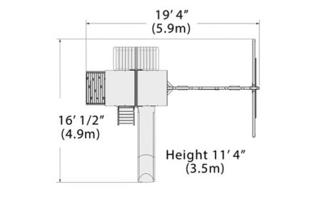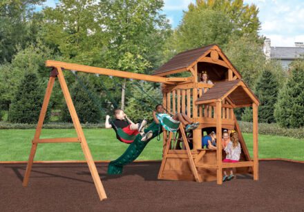 The Adventure Outlook 3 swing set is exactly what you’ve been looking for. The fort structure has a 5′ high deck with over 20 sq. ft. of play space. This play structure also includes a wood roof, gable kit, 3 position 8′ swing beam, 2 – belt swings, trapeze bar, playhouse, side table with roof, 5′ rock wall, and double walled wave slide. Summit Outlook play sets include a limited lifetime warranty on all wood, metal, and hardware components.