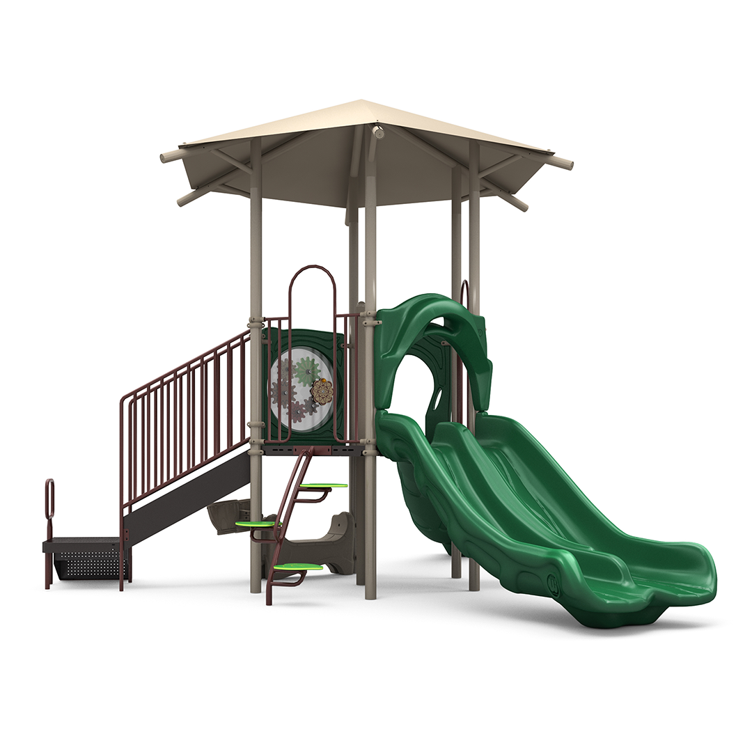 Featuring dual slides for active play, an optional leaf roof for shade, and an interactive gear panel for sensory engagement. With easy-access stairs and a climbing system, The Bugaloo promotes motor skills, while durable, weather-resistant materials ensure long-lasting use in school playgrounds and commercial playground equipment settings.