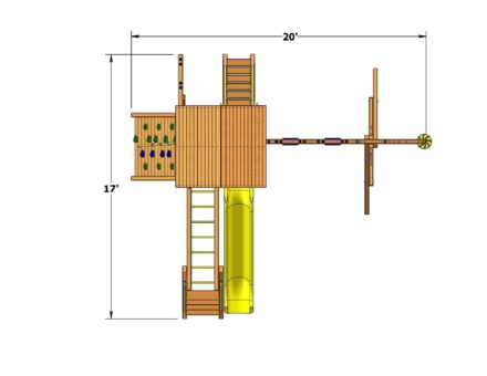 Includes: Wood roof, 10′ wave slide, grip-n-go bar, rockwall with climbing rope, step ladder with handrails, 3 position swing beam with 2 belt swings and knotted rope with disc, accessory arm with trapeze bar, lower enclosure with floor, monkey bars, ships wheel and safety handles.