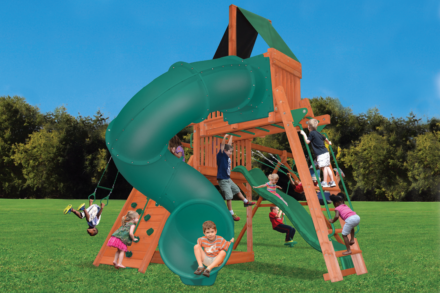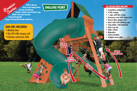 Accept no substitutes! The Deluxe Fort Combo 5 has everything you need for you to have your own tree house. From the huge deck area to the challenging rock wall you won’t find a sturdier more attractive play set. We begin with all cedar construction and then add a variety of features, like Monkey bars, a Sky Loft, and an Extreme Corkscrew Spiral Slide. What better way to introduce exercise into your child’s life while they’re just having fun!