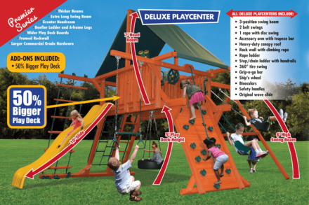 In a league of its own best describes this total activity center. Our Deluxe Playcenter Combo 2 XL gives you so much more for so much less! Starting with all natural cedar lumber, with a 50% Bigger Playdeck, along with added multiple climbing/swinging activities, this system can keep the whole family entertained for years to come. Once again Playground One® has defined quality and value at an affordable price!