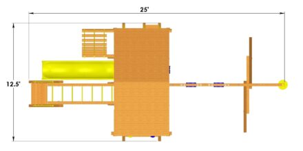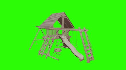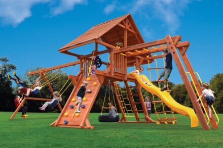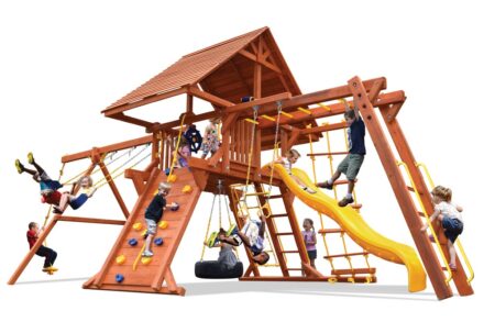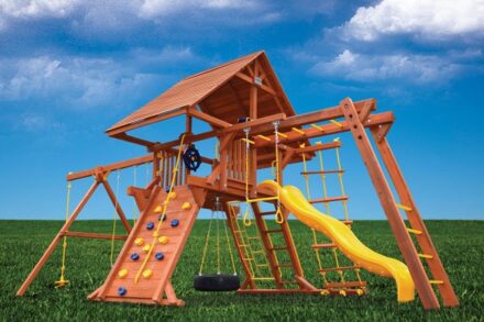 Includes: Wood roof, 10′ wave slide, grip-n-go bar, rockwall with climbing rope, rope ladder, step/chain ladder with handrails, 3 position swing beam with 3 belt swings and knotted rope with disc, accessory arm with trapeze bar, 360° tire swing, monkey bars, ships wheel and safety handles.