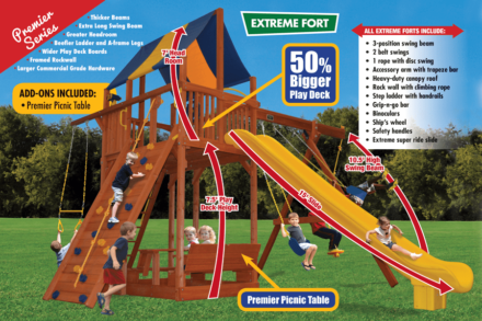 What can you expect with the Extreme Fort? Everything!! With a 7.5 ft playdeck height, 15 ft Extreme Ride Super Slide, Heavy Duty Canopy Roof, Premier Picnic Table and a 10.5 ft high Swing Beam so you can take your backyard to the Extreme. Dare to compare and find out once again why Playground One® will let your imagination FLY!