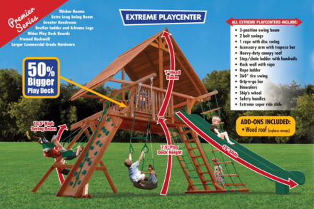 Why not try to touch the sky? The Playground One® Extreme Playcenter Combo 2 with Wood Roof offers the highest deck height available and the largest deck size we offer. At a 7.5 ft deck height and 35 sqft of play area, the Extreme Playcenter has a 15 ft slide, 10.5 ft high swing beam, Wood Roof, rockwall and step/chain ladders, 360° tire swing, ships wheel and safety handles. Why not offer your family the best of everything? This total activity center is In a league of its own.