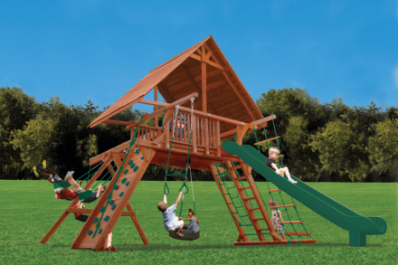 Includes: Wood Roof, 15′ extreme ride super slide, rockwall with climbing rope, rope ladder, step/chain ladder with handrails, swing beam with 2 belt swings and knotted rope with disc, grip-n-go bar, accessory arm with trapeze bar, 360° tire swing, ships wheel and safety handles.