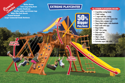 Why not try to touch the sky? The Playground One® Extreme Playcenter offers the highest deck height available and the largest deck size we offer. At a 7.5 ft deck height and 35 sqft of play area, the Extreme Playcenter has a 15 ft slide, 10.5 ft high swing beam, rockwall and step/chain ladders. Why not offer your family the best of everything? This total activity center is in a league of its own!