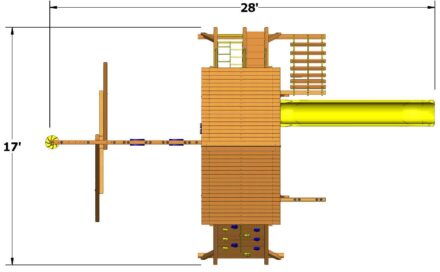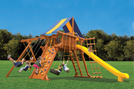 Includes: Heavy duty canopy roof, 15′ extreme ride super slide, rockwall with climbing rope, rope ladder, step/chain ladder with handrails, swing beam with 2 belt swings and knotted rope with disc, grip-n-go bar, accessory arm with trapeze bar, 360° tire swing,