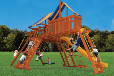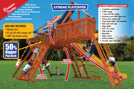 The Playground One® Extreme Playcenter Combo 4 offers all the features you want at the highest deck heights available. With a 7.5 ft deck height and 35 sqft of play area, the Extreme Playcenter offers the best bang for your buck. With a 15 ft Super Slide, 10.5 ft high swing beam, 4” x 6” Heavy Duty construction, Monkey Bars, Skyloft XL, Rockwall and Step/Chain ladders. Dare to compare and find out once again why Playground One® will let your imagination FLY!