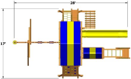 Includes: Two heavy duty canopy roof, 15′ extreme ride super slide, rockwall with climbing rope, rope ladder, step/chain ladder with handrails, swing beam with 2 belt swings and knotted rope with disc, grip-n-go bar, 360° day dreamer swing, monkey bars with handrails, sky loft XL, ships wheel and safety handles.