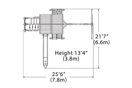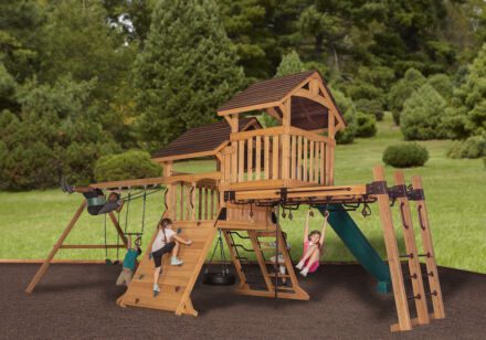 The Adventure Summit XL 3 swing set is packaged with the ultimate climber and loft as a cost effective option for adding the longest 14′ rocket slide. The fort structure has 5′ and 7′ high decks with over 45 sq. ft. of play space. This play structure also includes wood roof XL, gable kit, 3 position 8′ swing beam, 2 – belt swings, trapeze bar, ultimate climber, loft, and 14′ rocket slide. Summit Outlook play sets include a limited lifetime warranty on all wood, metal, and hardware components.