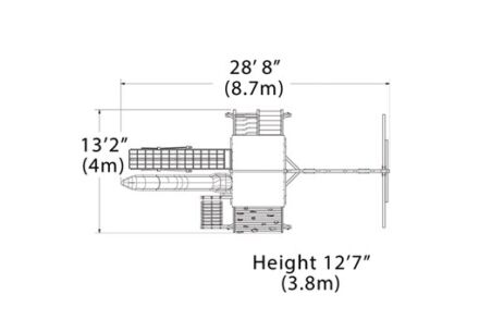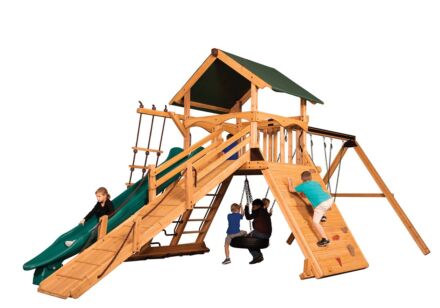 The Olympian Peak XL 2 playset also includes a gang plank for easy access into your child’s imaginary ship! The fort structure has a 6′ high deck with 30 sq. ft. of play space. This playset also includes a tarp roof, 3 position 9′ swing beam, 2 – belt swings, trapeze bar, 12′ rocket slide, gang plank, and an accessory arm with rope ladder. Peak Series play sets include our exclusive limited lifetime warranty on all wood, metal, and hardware components.