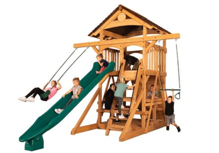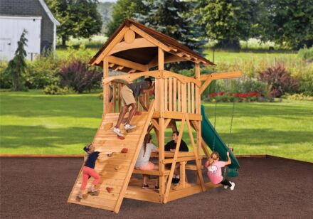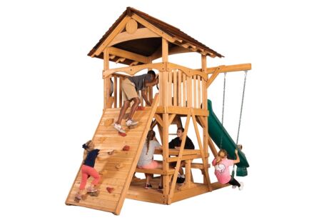 The Olympian Treehouse XL 2 Space Saver swing set is compact and designed to fit into almost any backyard space with lots of play value! The fort structure has a 6′ high deck with 30 sq. ft. of play space. This swing set also includes a wood roof, 2 – gable kits, 2 position 9′ swing beam, belt swing, trapeze bar, 12′ rocket slide, 6′ rock wall, lower floor, picnic table. Treehouse Series play sets include our exclusive limited lifetime warranty on all wood, metal, and hardware components.
