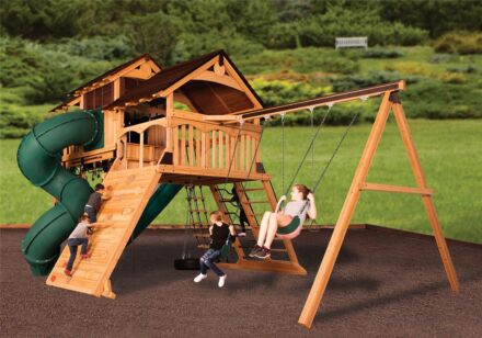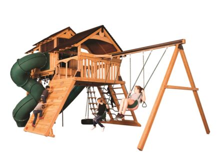 The Titan Peak Jumbo 3 playset is massive with a tall ultimate climber monkey bars to help build strength in teenagers and adults, plus it includes our talles 9′ slide! The fort structure has 7′ and 9′ high decks with 84 sq. ft. of play space. This playset also includes wood roofs, 2 – gable kits, upper cabin package, 3 position 10′ swing beam, 2 – belt swings, trapeze bar, 14′ rocket slide, 9′ spiral tube slide, 8.5′ ultimate climber monkey bars, and an accessory arm with rope ladder. Peak Series play sets include our exclusive limited lifetime warranty on all wood, metal, and hardware components.