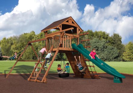The Olympian Summit XL 1 swing set comes standard with incredible value. The fort structure has a 6′ high deck with over 25 sq. ft. of play space. This play structure also includes wood roof XL, gable kit, accessory arm with rope ladder, accessory arm with trapeze bar, 3 position 9′ swing beam, 3 – belt swings, and 12′ rocket slide. Summit Outlook play sets include a limited lifetime warranty on all wood, metal, and hardware components.