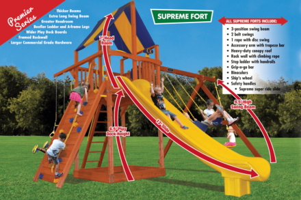 Just imagine the memories that will be made on this Supreme Fort! The 6.5′ platform height , 13′ super slide and 9.5′ high swing beam will provide endless hours of fun for the kids and peace of mind for parents knowing the unit is constructed with massive 4×4 and 4×6 all natural chemical free cedar. A rock wall and a heavy duty canopy roof are included as standard features! Dare to compare and you’ll find the Supreme Fort is considered another best in class/best in value playset only offered from Playground One®!