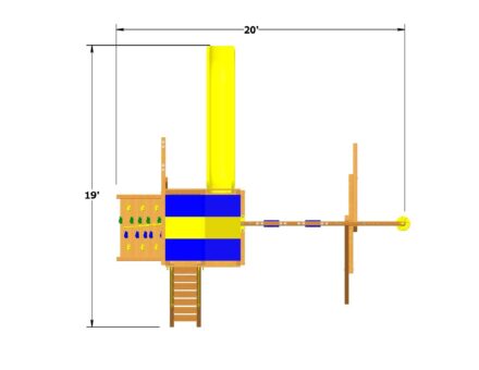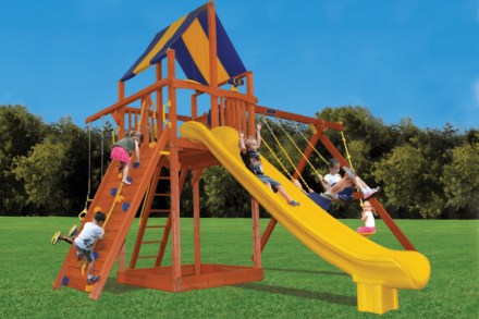 Includes: heavy duty canopy roof, 13′ super ride slide, rockwall with climbing rope, step ladder with handrails, 3 position swing beam with 2 belt swings and knotted rope with disc, grip-n-go bar, accessory arm with trapeze bar, ships wheel and safety handles.