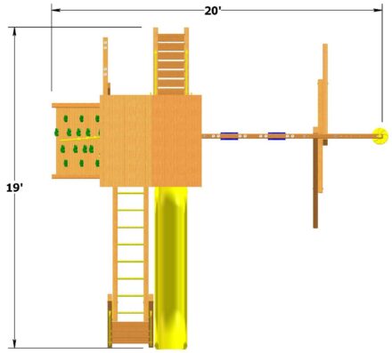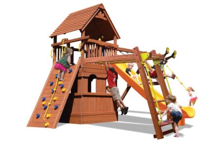 Includes: Wood roof, 13′ super slide, rockwall with climbing rope, step ladder with handrails, 4 position swing beam with 3 belt swings and knotted rope with disc, grip-n-go bar, accessory arm with trapeze bar, lower level playhouse with floor, monkey bars, ships wheel and safety handles.