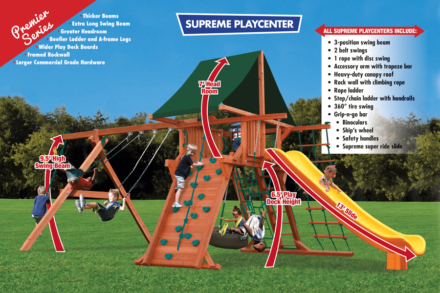 SUPREME best describes the newest addition to the Playground One® lineup! This playcenter has it all and then some at a price that even the most discriminating play set shopper will appreciate. Showcasing 4″ x 6″ heavy duty construction, a 6.5′ high play deck with a 13” super slide and a 9.5′ high swing beam this unit will challenge the most active youngsters throughout their childhood. Dare to compare and find out once again why Playground One® will let your imagination fly!
