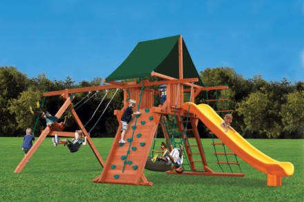Includes: Heavy duty canopy roof, 13′ super slide, rockwall with climbing rope, rope ladder, step/chain ladder with handrails, 3 position swing beam with 2 belt swings and knotted rope with disc, grip-n-go bar, accessory arm with trapeze bar, 360° tire swing, ships wheel and safety handles.