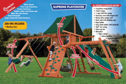 This Supreme Playcenter Combo 3 takes your playcenter to the next level. Showcasing 4″ x 6″ heavy duty construction, a 6.5′ high play deck with a 13′ super slide, Monkey Bars, and a 9.5′ high swing beam this unit will challenge the most active youngsters throughout their childhood. See how Playground One® will let your imagination FLY!