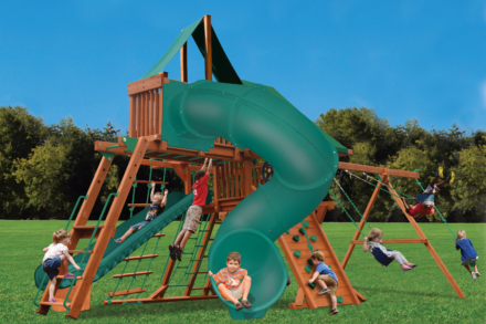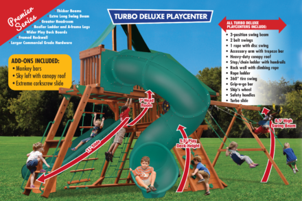 Now it is time to take your Playcenter to the next level!!! With the Turbo Deluxe Playcenter Combo 5, you can have it all and with these fantastic features you can see why. Featuring 4″ x 6″ heavy duty construction, a 5′ 6” high play deck with an 11′ slide, Monkey Bars, Sky loft, an Extreme Corkscrew Spiral Slide, this system offers the most challenges and will keep the most active youngsters moving through their childhood.