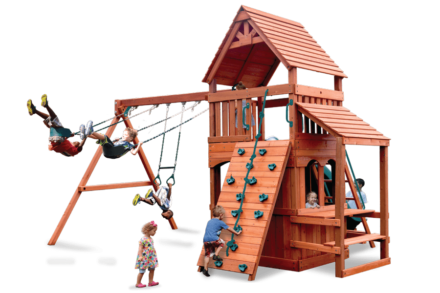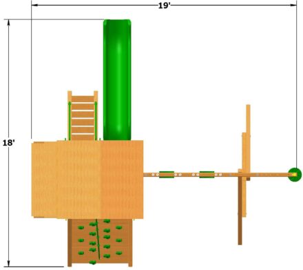 Includes: Wood roof, 11′ slide, rockwall with climbing rope, step ladder with handrails, 3 position swing beam with 2 belt swings and knotted rope and disc, grip-n-go bar, cafe table, lower level playhouse with floor, ships wheel and safety handles.