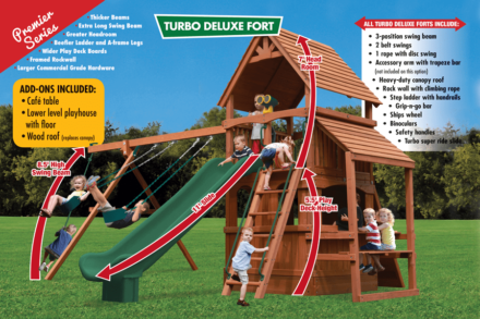 Turbo the height equals turbo the fun! Longer slide, higher play deck, lap beveled wood roof, Lower Level Playhouse with Floor, Cafe Table and a more challenging rock wall are just a few of the features that comprise the Turbo Fort! Built to challenge the most active children (and parents), the Turbo Deluxe Fort Hangout has it all. Dare to compare and find once again why Playground One® will let your imagination FLY!