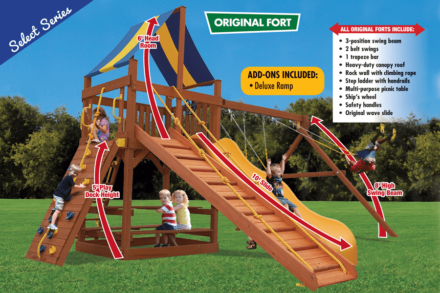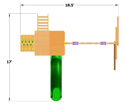 Includes: Wood roof, 11′ turbo slide, rockwall with climbing rope, step ladder with handrails, 3 position swing beam with 2 belt swings and a trapeze bar, 3 in 1 picnic table, ships wheel and safety handles.